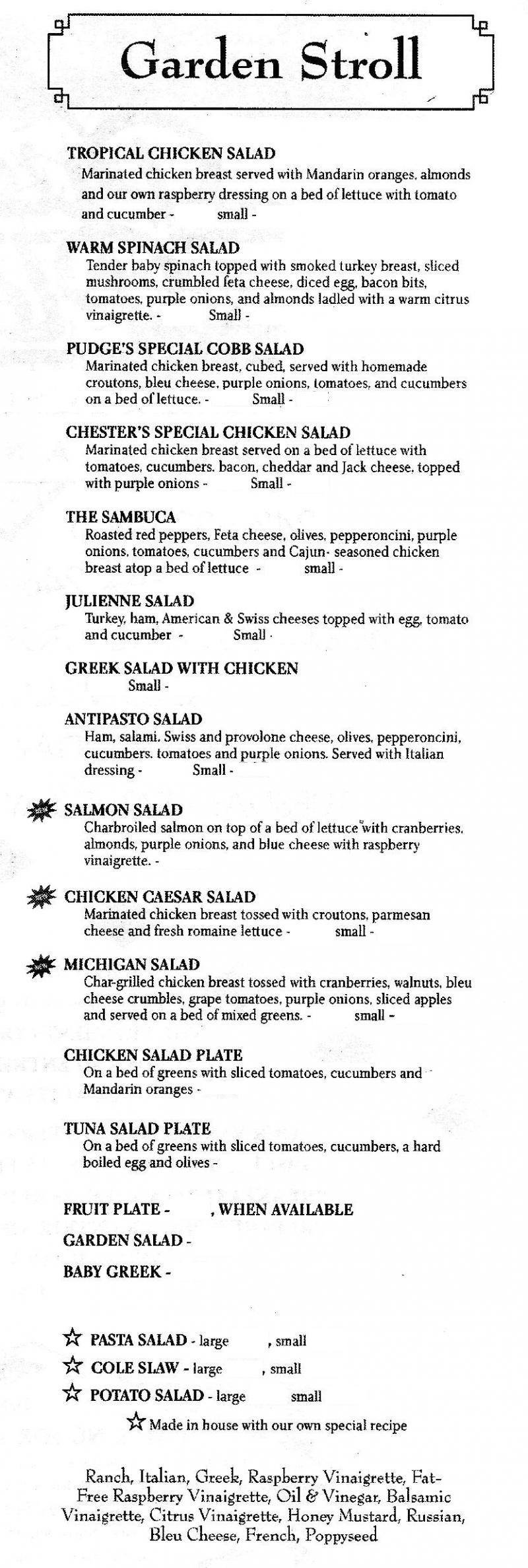 Salad for lunch, Soups (check out our soup 1/2 sandwich specials), Appetizers (munchies), Kids Corner (menu)